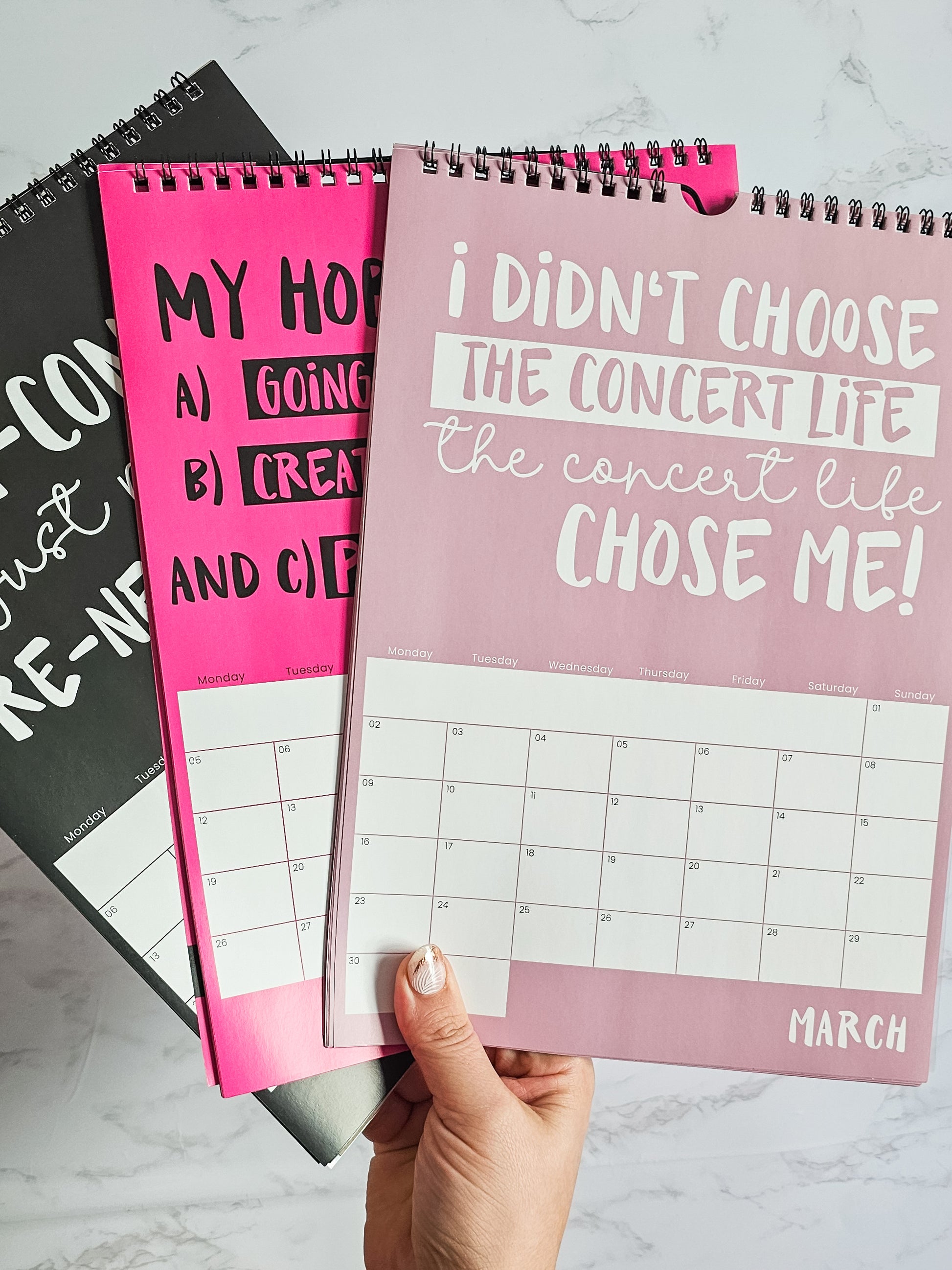 Der neue A4 Konzertliebe-Kalender für das Jahr 2026 mit 13 Seiten in schwarz, pink oder rosa. Voll mit Lieblingssprüchen rund um das Thema Konzerte und Musik!